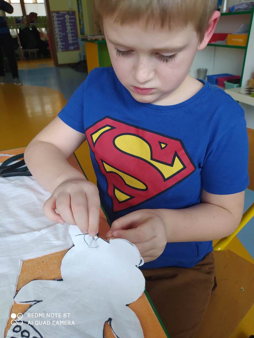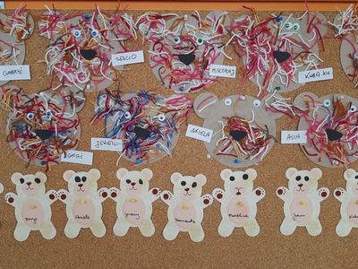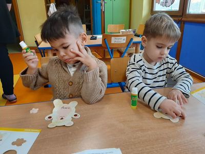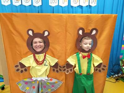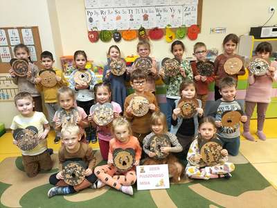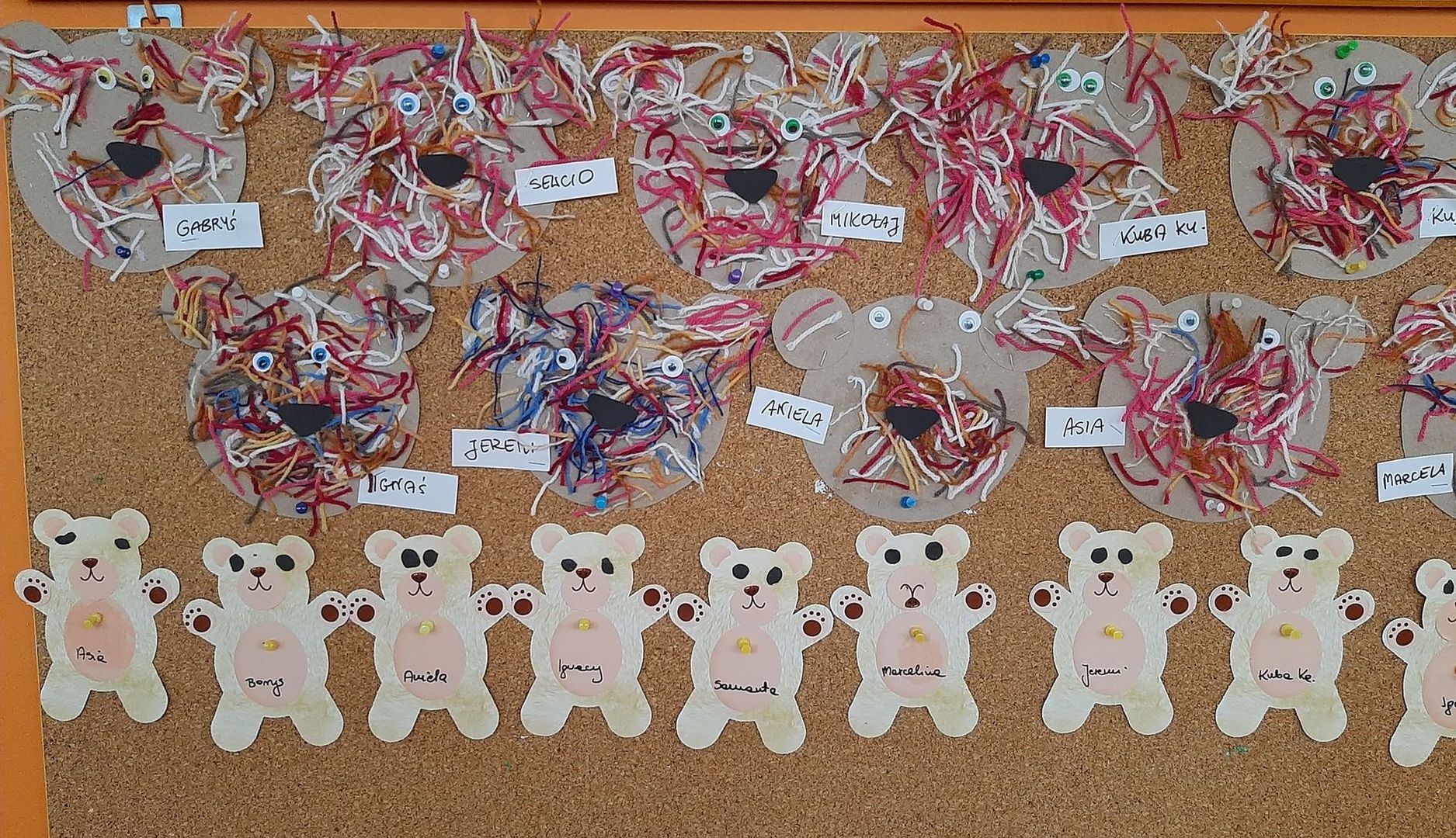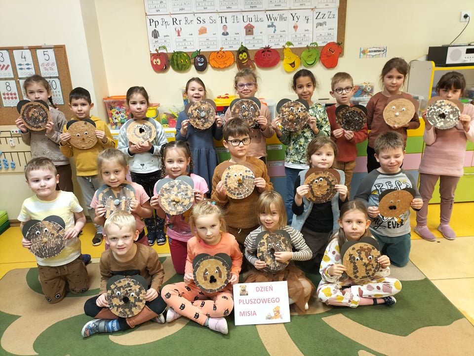były zagadki, wiersze, kolorowanki, prace plastyczno- techniczne, "Misiobudka" i misiowe piosenki i przeboje do tańca. W trakcie zajęć dzieci poznawały także historię powstania pluszowego misia, dzięki czemu uświadomiły sobie, jak długo miś funkcjonuje już w kolekcji zabawek dziecięcych oraz jak ważną rolę pełni w życiu niejednego dziecka. Dzieci ubrane na brązowy kolor przyniosły w tym dniu swojego ulubionego pluszowego misia.