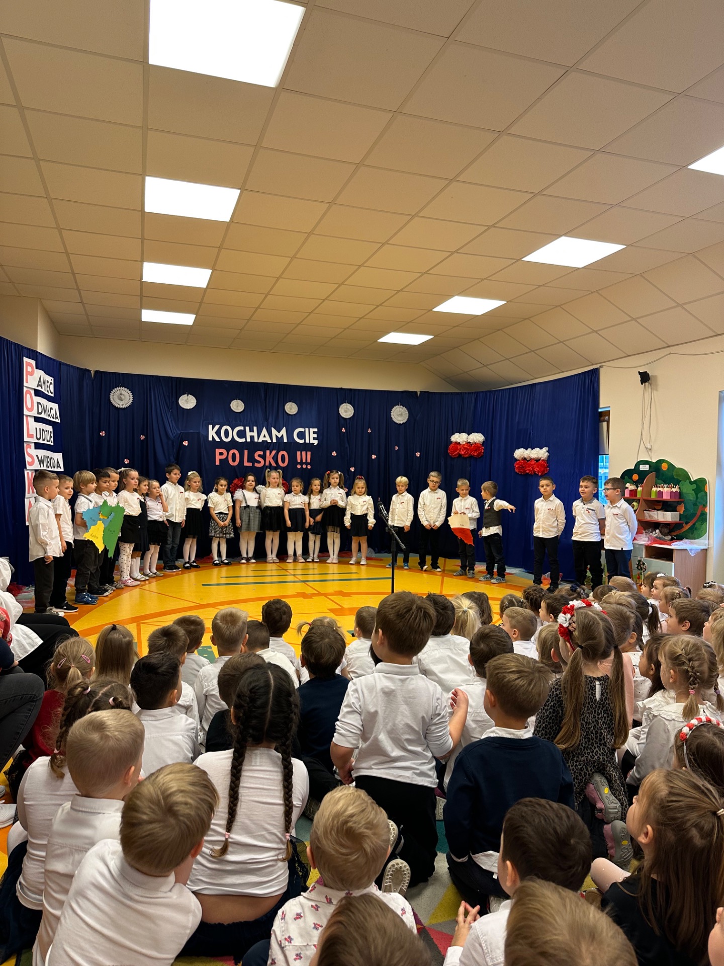 Dzieci 6-letnie z grupy Pieski zaprezentowały przepiękny występ artystyczny. Mali artyści z ogromnym zaangażowaniem recytowali wiersze i śpiewali pieśni patriotyczne. Dzięki ich występowi w przedszkolu zapanowała prawdziwie uroczysta i wzruszająca atmosfera. Zwieńczeniem tego pięknego wydarzenia było uroczyste, wspólne odśpiewanie Mazurka Dąbrowskiego.