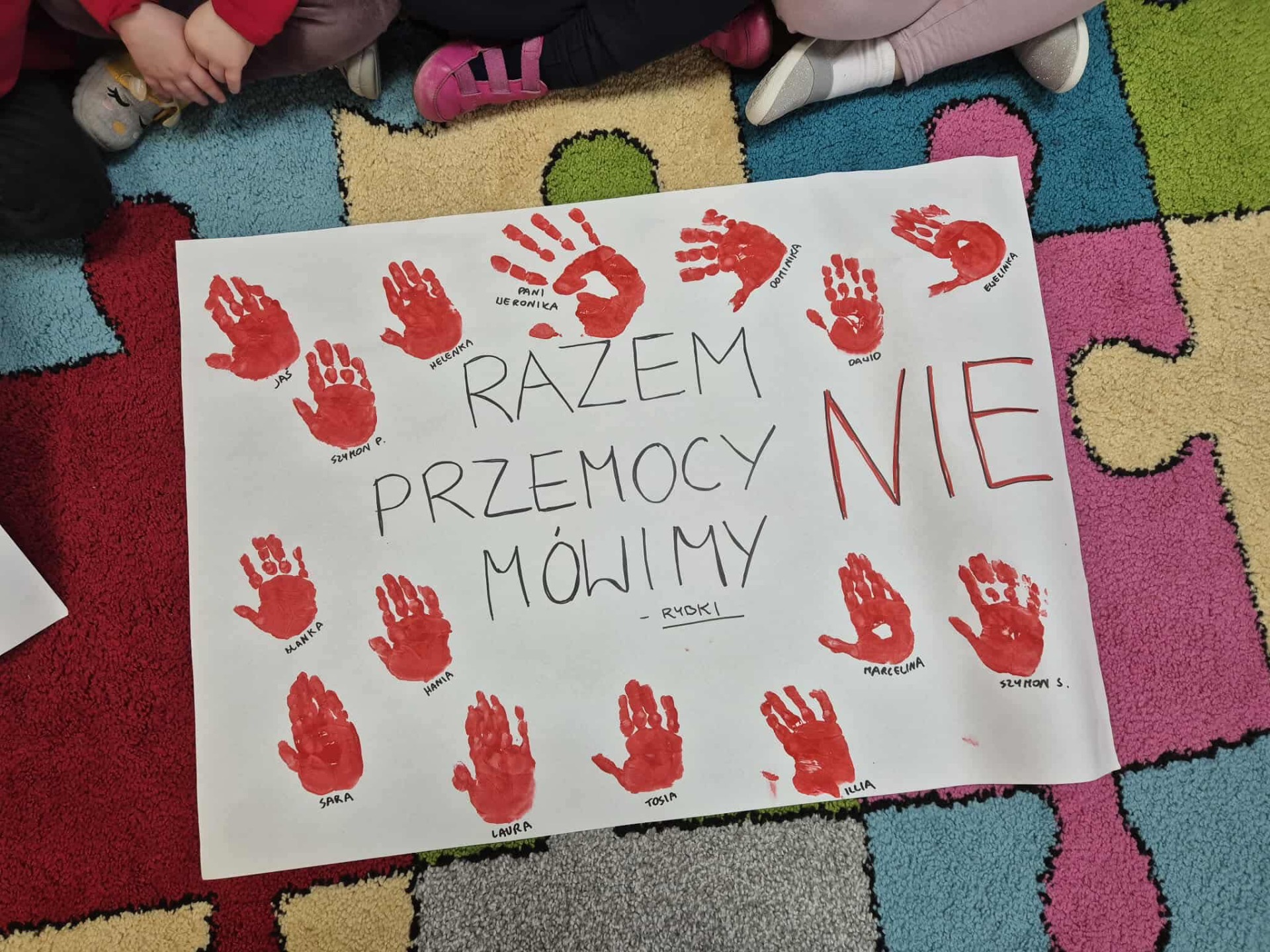 19 listopada 2025r. w naszej placówce królowała czerwień. Tego dnia dzieci założyły ubrania w kolorze czerwonym, który symbolicznie oznacza STOP. Tym gestem wyraziliśmy nasz brak zgody na krzywdzenie, cierpienie i wszelkie rodzaje przemocy wobec dzieci. W całej placówce odbyły się zajęcia zwiększające świadomość dzieci dotyczącą ich nietykalności oraz praw, a także umiejętności unikania zagrożeń, szukania pomocy, czy reagowania na przemoc.