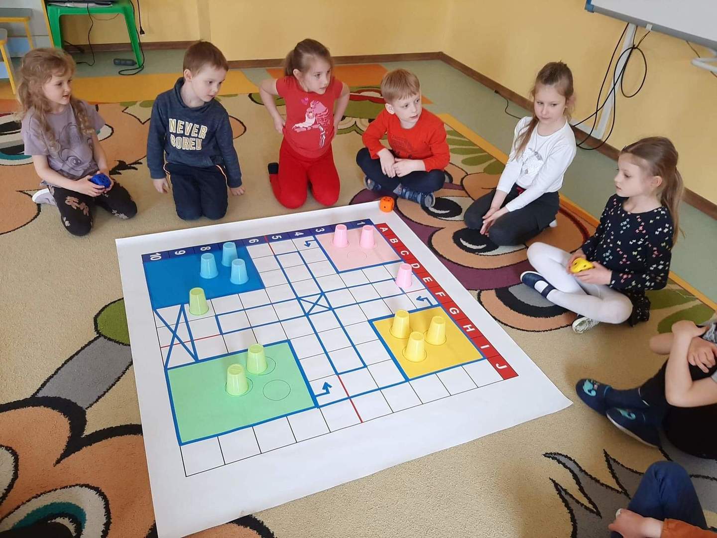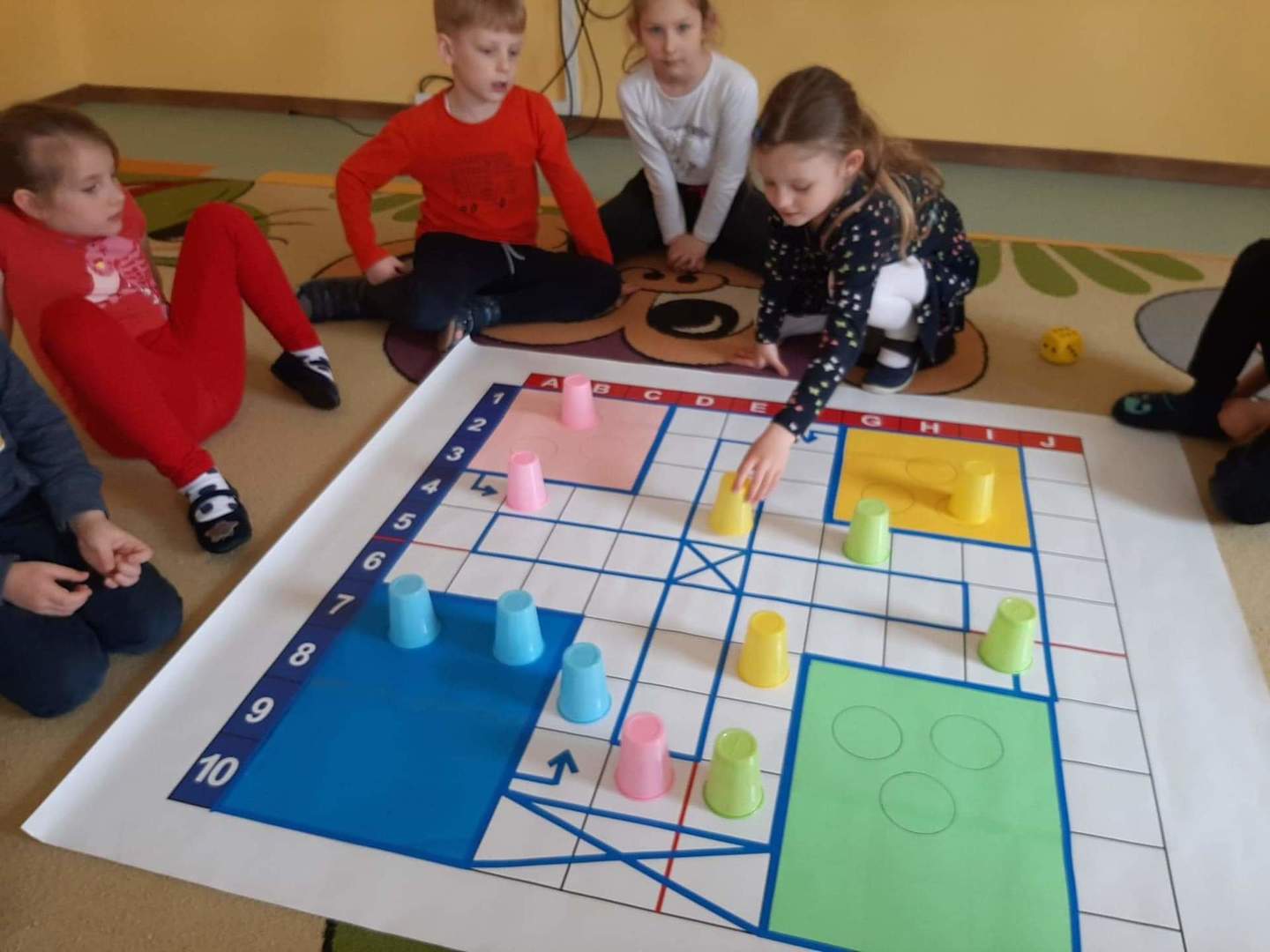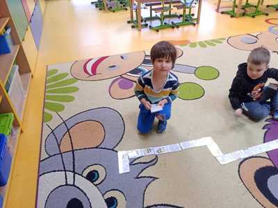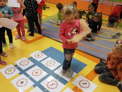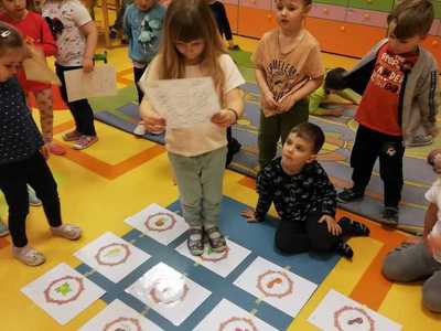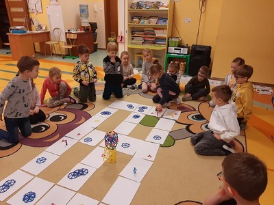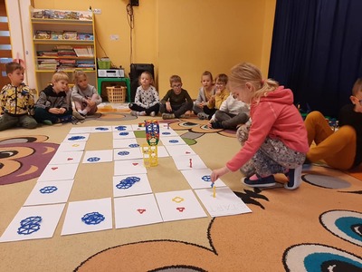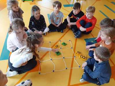Poza tym dzieci kodują na dywanie z wykorzystaniem maty do kodowania, tworzą razem z nauczycielami gry podłogowe i wymyślają do nich zasady